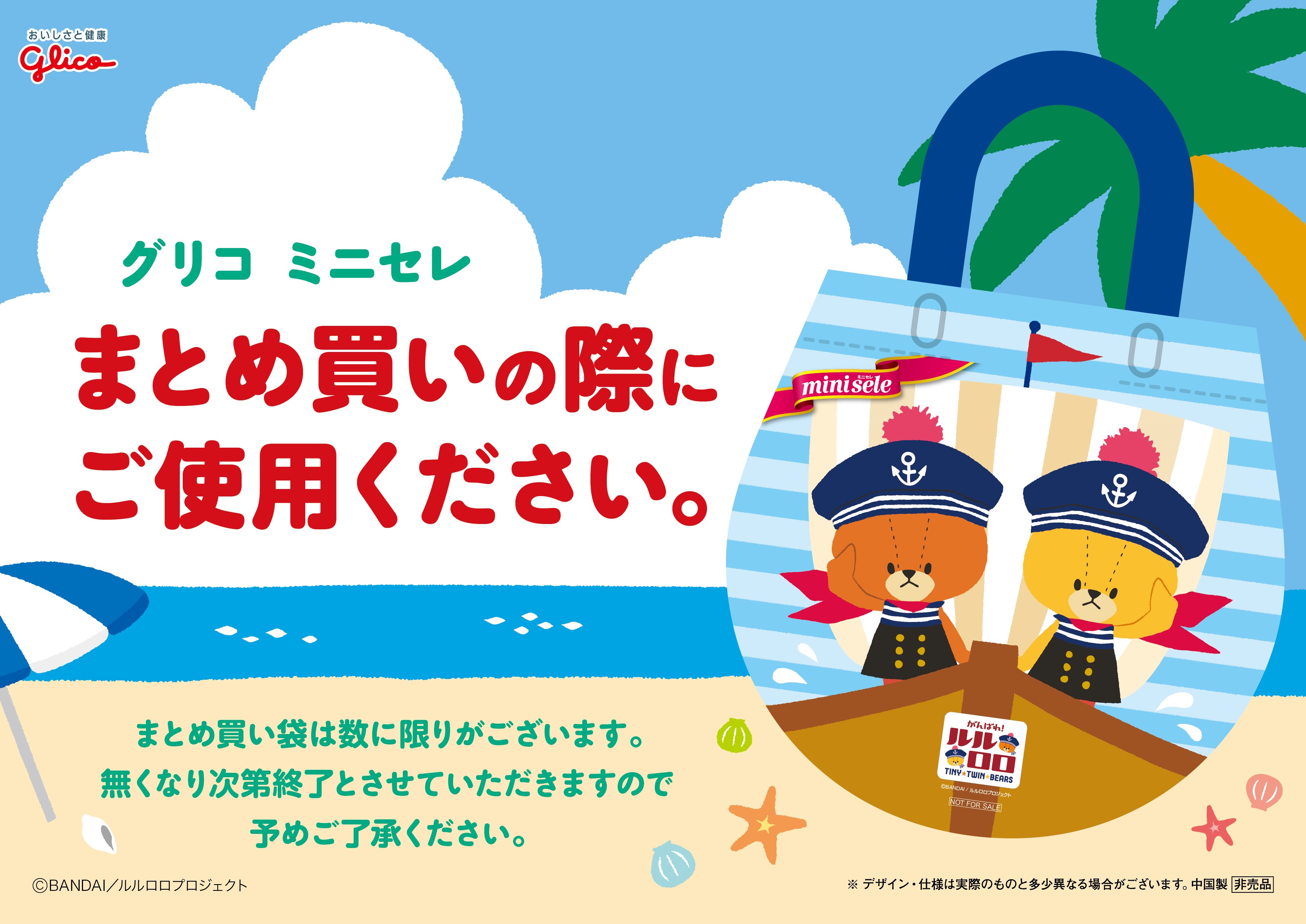 ■キャンペーン内容:期間中、グリコの「ミニセレ」をまとめてご購入頂くと、「がんばれ!ルルロロ」デザインのまとめ買い袋をプレゼントします。