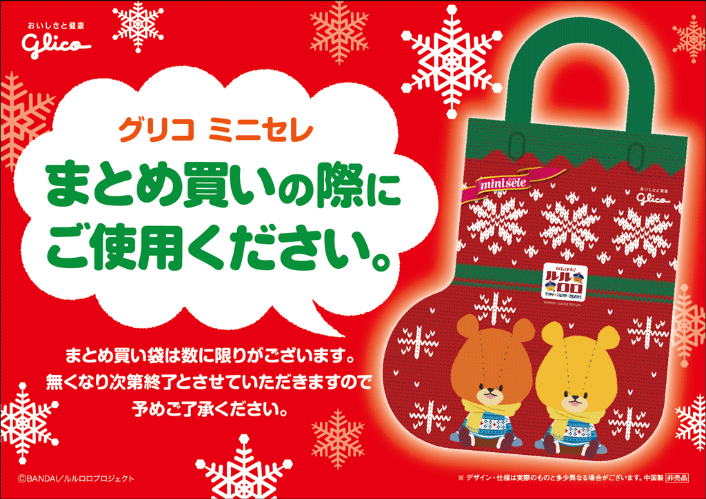■キャンペーン内容:期間中、グリコの「ミニセレ」をまとめてご購入頂くと、「がんばれ!ルルロロ」デザインのまとめ買い袋をプレゼントします。