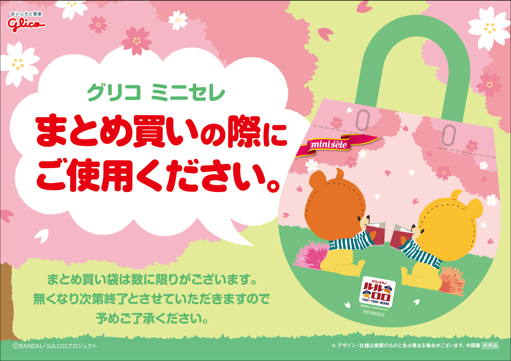 ■キャンペーン内容:期間中、グリコの「ミニセレ」をまとめてご購入頂くと、「がんばれ!ルルロロ」デザインのまとめ買い袋をプレゼントします。