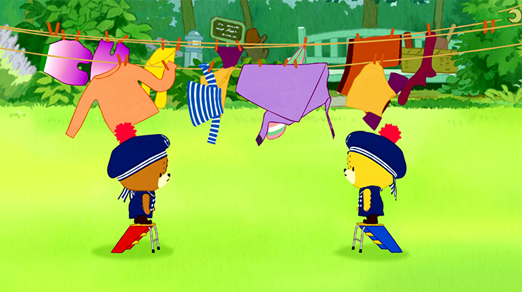ふたごのルルとロロ。今日のお仕事は、お洗濯をいーっぱいすることー!自分たちのシーツやパジャマ、まだ寝ているパパとママやそれからおばあちゃんのベッドからシーツをとって洗濯機に放り込みます。出来上がった大きなシーツを二人で干していると、風がびゅーんと吹いてきてシーツがふわっと飛んで行ってしまいました。探偵姿でおせんたくものの追跡を開始する二人でしたが…
