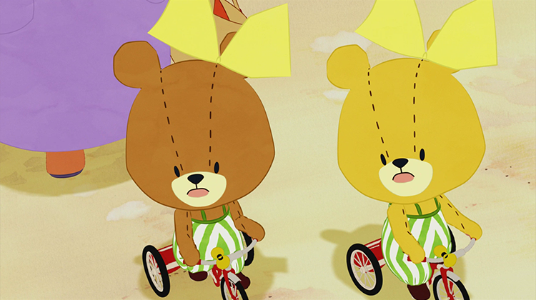 ふたごのルルとロロ。パンパカパーン、今日のお仕事は、三輪車大レースでがんばることー!やる気満々の二人が、えっちらおっちら三輪車をこいでスタートしました。けいと屋さんのおばさんにアメをもらっている間にロロがお先にしつれー!今度はマギーと話している間にルルがお先にしつれー!と競り合ってこぎ続ける二人。そんなとき雨が降りだして…